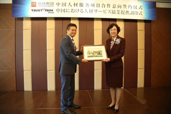 2016年5月18日上午,聯橋集團與株式會社TRUST TECH“中國人材服務項目合作意向簽約儀式”在東京舉行,聯橋集團董事長慕镕鍵與株式會社TRUST TECH社長西田穣代表雙方簽署了合作協議,威海市委副書記、市長張惠,高區黨工委書記、管委會主任劉偉,威海市商務局局長鄧勇,聯橋集團董事、副總經理于福杰等領導出席儀式。
