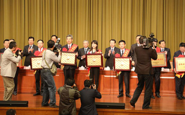山東省人民政府省長龔正(后排右三)為聯橋集團頒發獎牌
