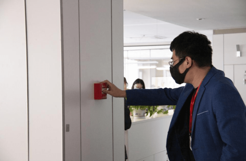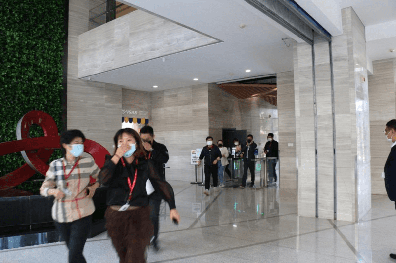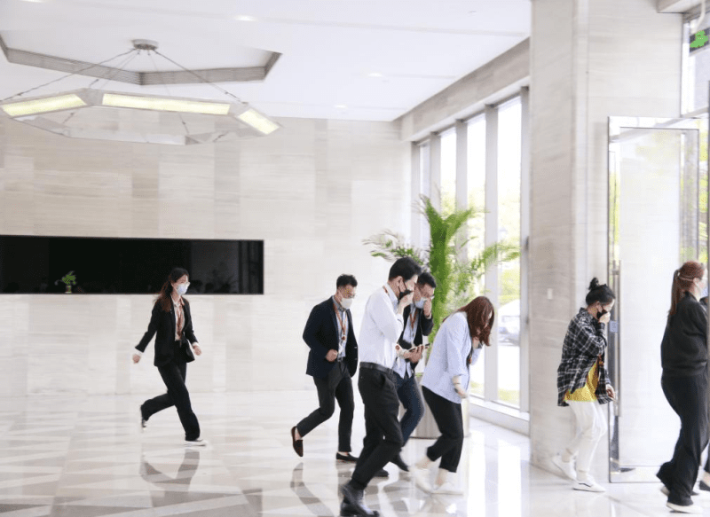 與此同時,應急廣播在接到“火情”第一時間起,相關樓層員工聽到廣播在安全員的指揮引導下,快速有序地集體撤離至安全集合點,相關負責人統計清點人員。