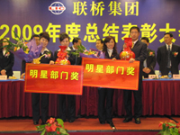 董海波副總經理首先宣讀了《聯橋集團關于表彰2009年度先進的決定》,授予進口部“卓越貢獻獎”,紡織八部、紡織九部“明星部門獎”,紡織二部等10個部門“先進部門獎”,授予徐建禮等10名員工“敬業精英”,孫永進等27名員工“先進個人”,董文忠、張建軍2名員工“團隊協作獎”榮譽稱號。頒獎儀式結束后,獲獎部門代表進行了大會發言,總結了2009年各項工作,匯報了2010年工作計劃。