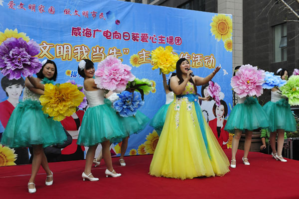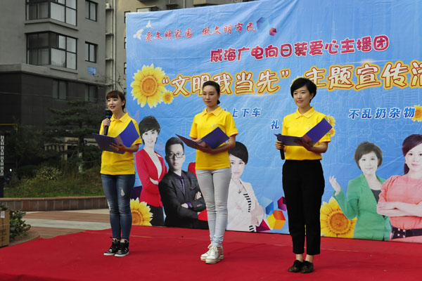 2015年10月16日,威海廣電攜手聯(lián)橋集團(tuán)在集團(tuán)海天一品社區(qū)噴泉廣場(chǎng)舉行“文明我當(dāng)先”主題宣傳活動(dòng)。威海電視臺(tái)愛心主播白雪、張帆、齊賽、劉偉豪等親臨現(xiàn)場(chǎng),通過(guò)節(jié)目表演、知識(shí)講解,做游戲等形式,與大家互動(dòng)交流,在輕松愉快中傳播“愛文明家園做文明市民”的理念。